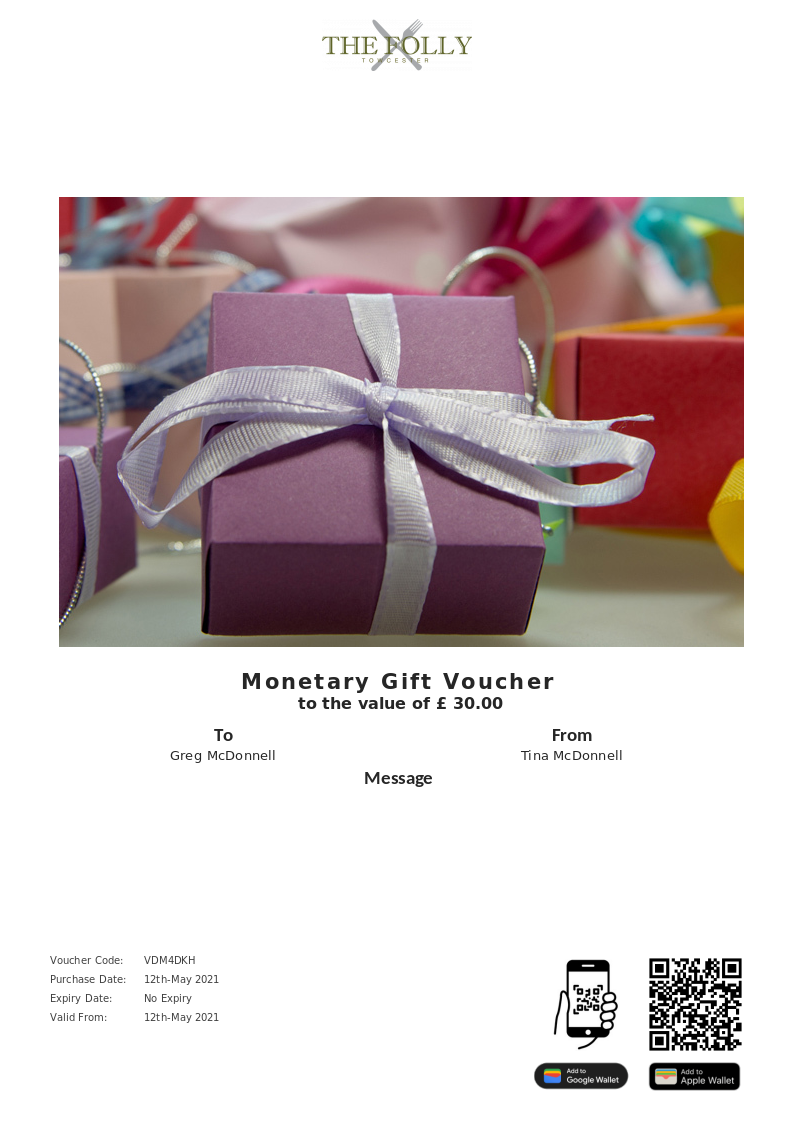 The Folly Towcester allows you to purchase instantly printable gift vouchers, special offers and tickets using the Voucher Connect platform.